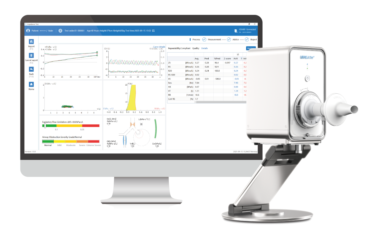 The IOS system applies short, pulsed pressure signals (containing a spectrum of low and high frequencies, typically from 5 to 35 Hz) to the patient’s airways via a mouthpiece. The device simultaneously measures the resulting pressure and flow signals at the mouth. By applying a principle analogous to Ohm’s law in electronics, it calculates Respiratory Impedance (Z).