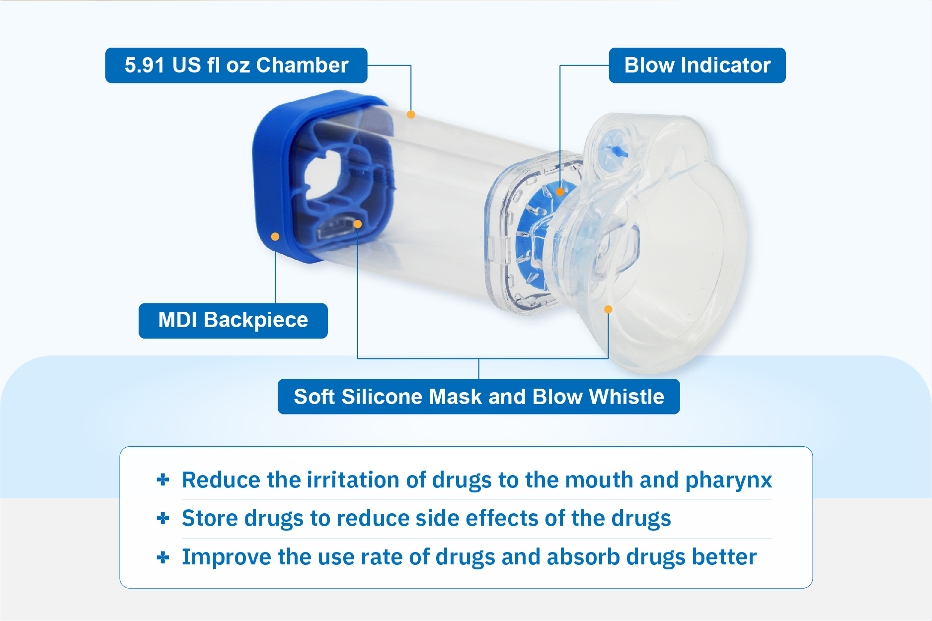 Provides a soft silicone mask to make an air tight seal around nose and mouth insuring no waste and fewer side effects
